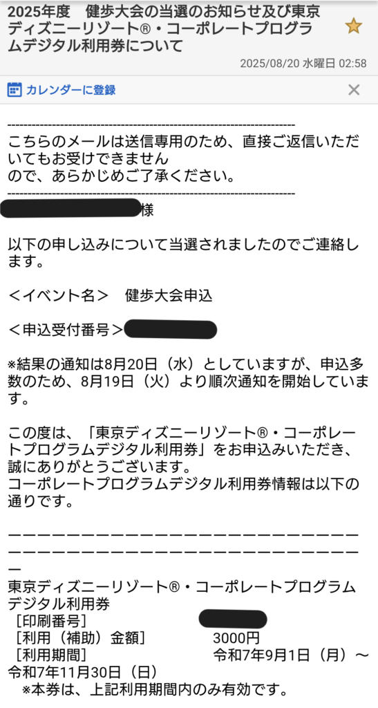 私は関東ITソフトウェア健康保険組合の被保険者となっております。その関東ITソフトウェア健康保険組合の福利厚生の一環として、抽選で東京ディズニーリゾート・コーポレートプログラムデジタル利用券が貰えます。