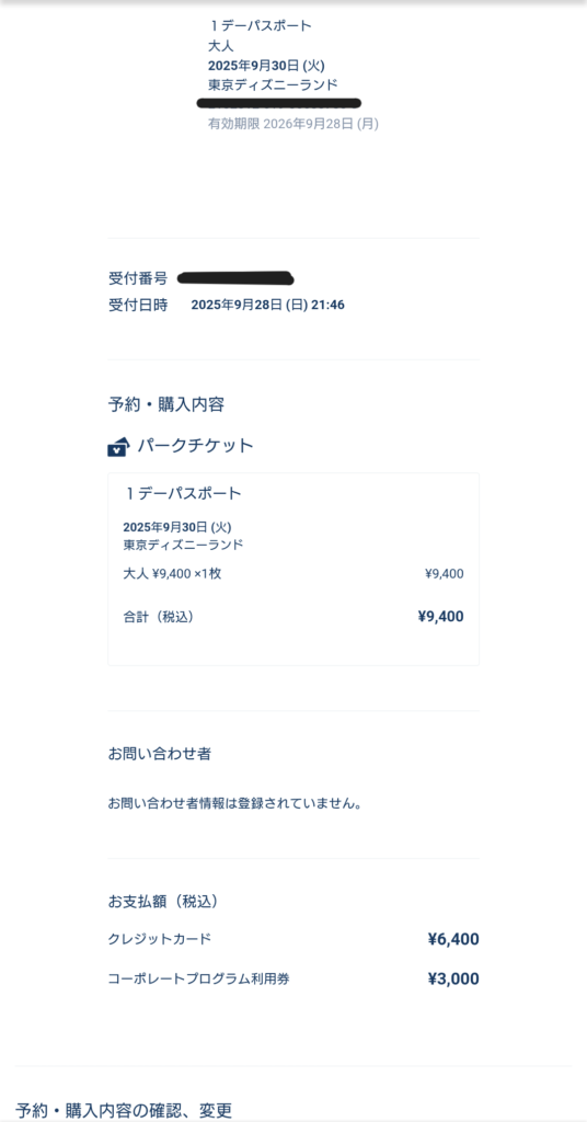 私が行く9月30日は、価格が9,400円に設定されていたので、そこからコーポレートプログラムデジタル利用券の3,000円を差し引いた、6,400円で1デーパスポートを購入しました。