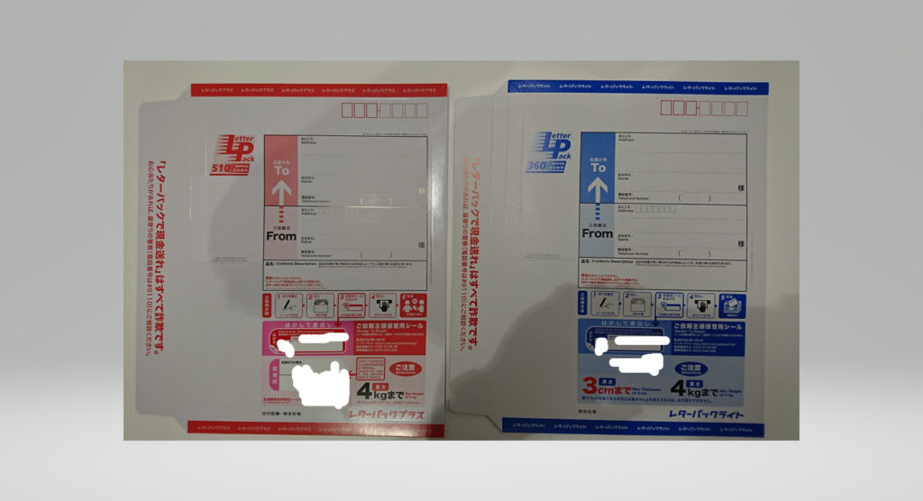 右の青のレターパックが「レターパックライト」で、左の赤いレターパックが「レターパックプラス」です。