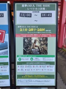 ところが富士山を空から眺める映像ライドは午前中のみしかやっておらず、午後からは「進撃の巨人 THE RIDE」というアトラクションでした。